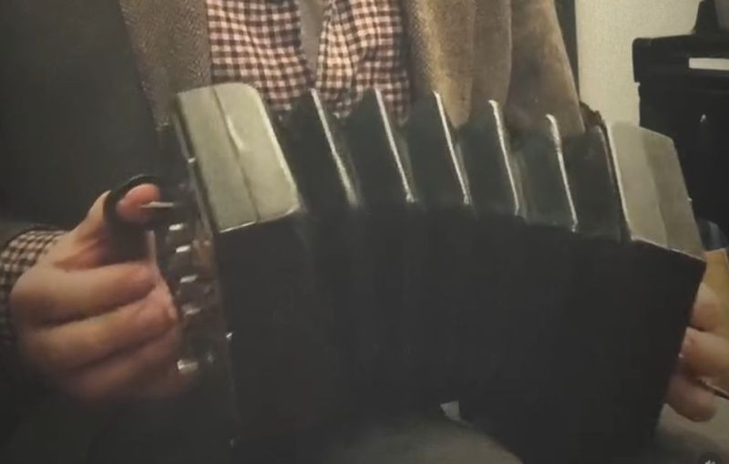 Six sided Nickel/Silver ends, 48 buttons. Name H. Boyd built within filagree end piece