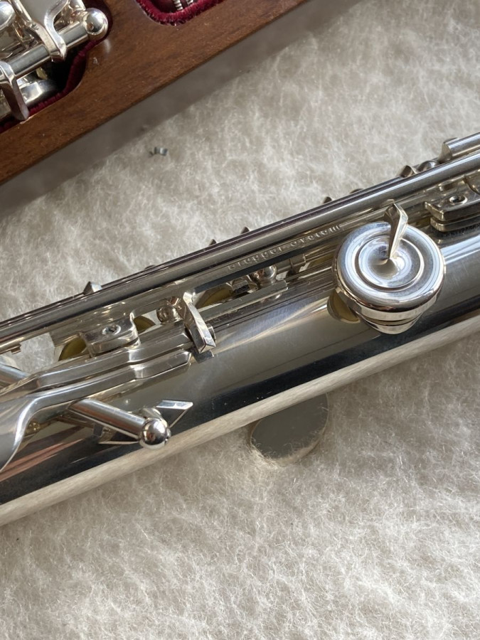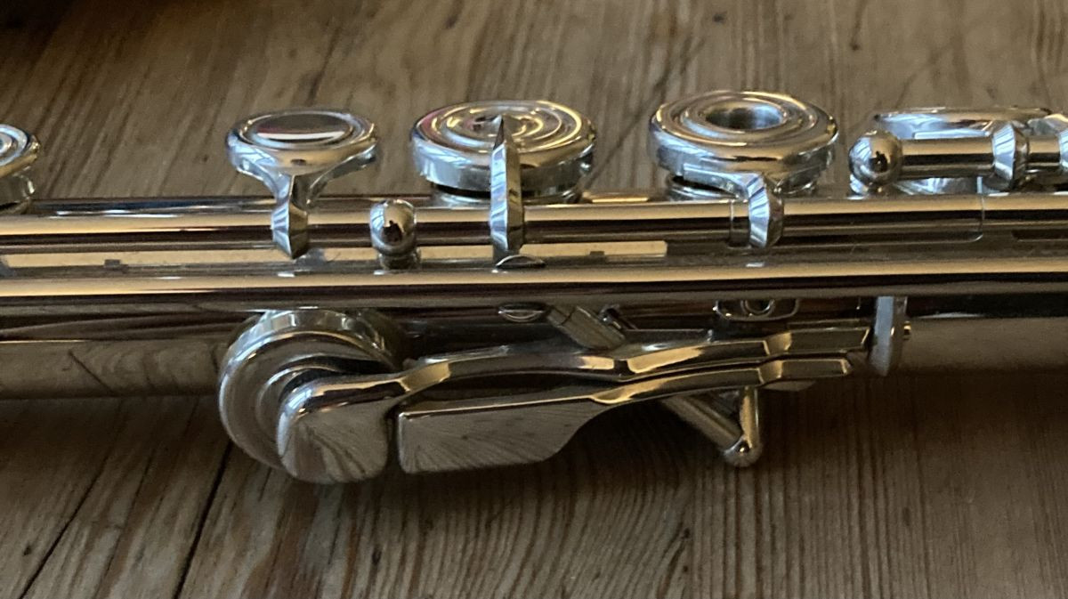 Solid silver flute with Full Brögger system, open-hole keys, E-mechanism, and C-foot, in like-new condition.