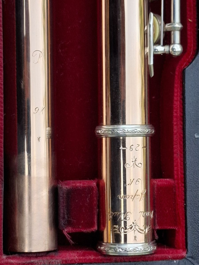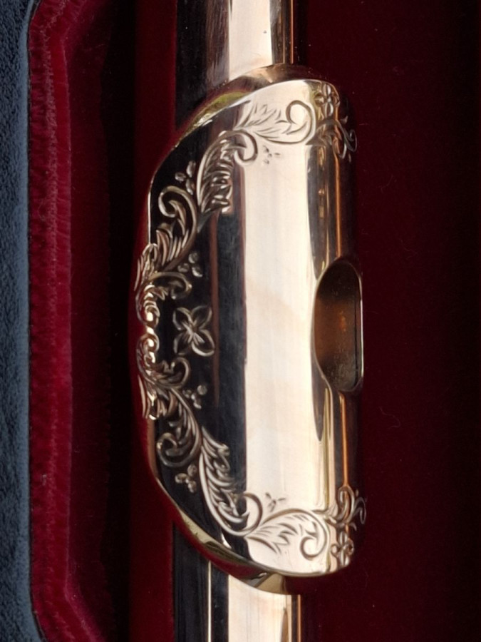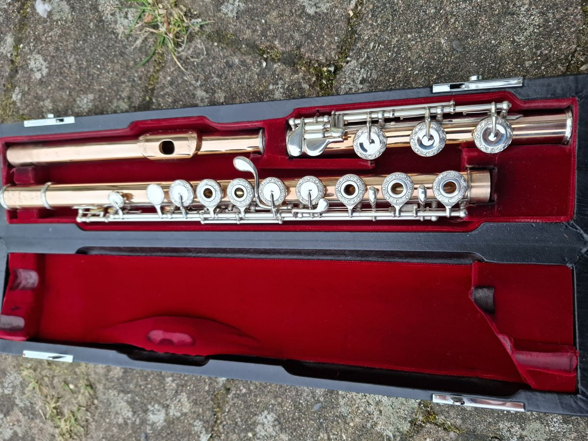 It is a 9K Rose Gold Pearl Handmade Flute, with Sterling Silver Mechanism, engraved keys and Lipplate. It has a 14K Riser as well.