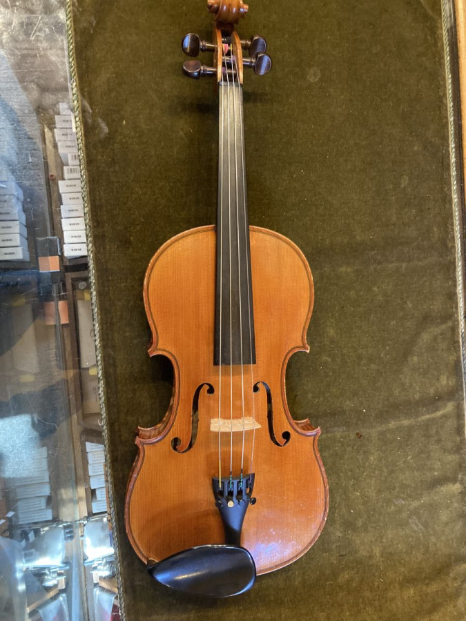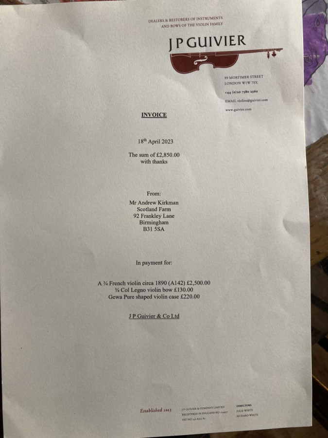 Lovely 3/4-size Mirecourt violin, Thibouville-Lamy type, purchased from J. P. Guivier two years ago for my son (who has grown out of it). Fabulous instrument in excellent condition. Also Col legno 3/4-size bow, £100.
