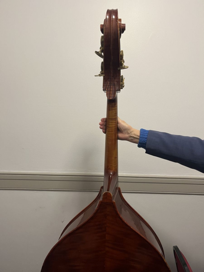 This bass has a lovely "Tiger Stripe" flare on the back with a fine, straight grain on the belly; all accentuated by a rich mid-brown oil varnish. Fittings are all in ebony with top quality strings.