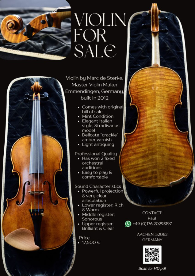 I am selling my much loved violin. The instrument was built for me by the highly regarded luthier Marc de Sterke in 2012, and has been well looked after since that time with frequent check-ups. I have enjoyed the wonderful characteristics of this instrument, but, since I changed to the viola, I would like this fine violin to find its next home.