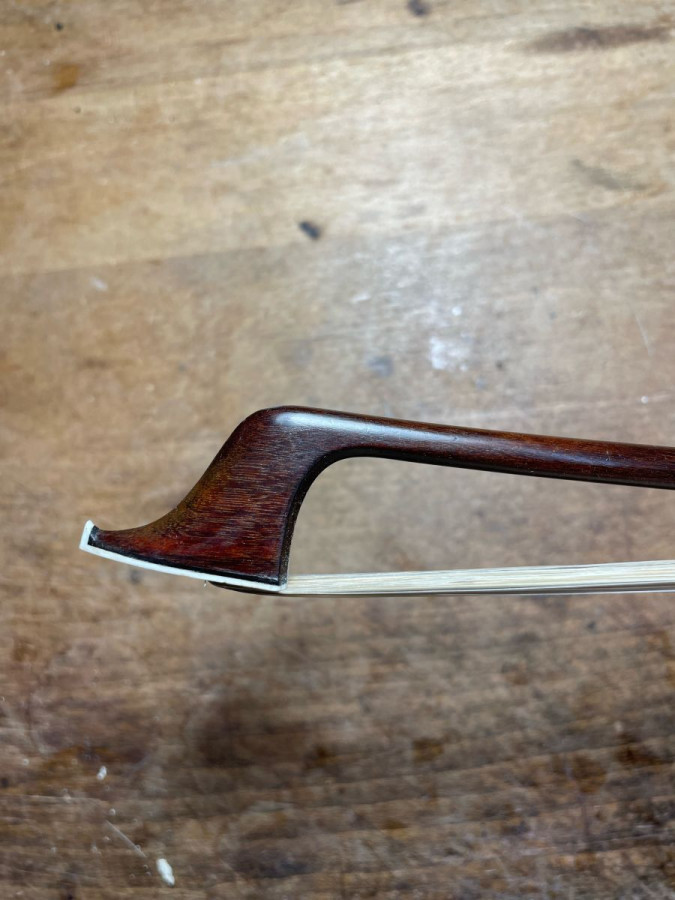 Très bel archet français ancien, authentique dans toutes ces parties principales de l'école française fait par Claude Auguste Thomassin vers 1910. La hausse est de la même époque et le bouton est moderne. Baguette en très beau bois de pernambouc de couleur brun foncé d'excellente qualité. Hausse montée en ébène et argent (restaurée sur le flanc droit) avec nacre, bouton en argent plein. Bel ensemble en très bon état.