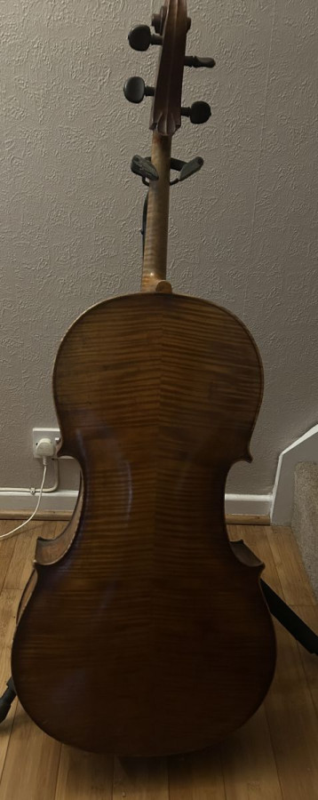 Beautiful German Cello in good condition. Two piece back of strong figure, ribs and head of similar wood. Two piece table of similar grain, varnish of red brown colour on a golden ground . Length of back 770mm. It makes a gorgeous sound when played.