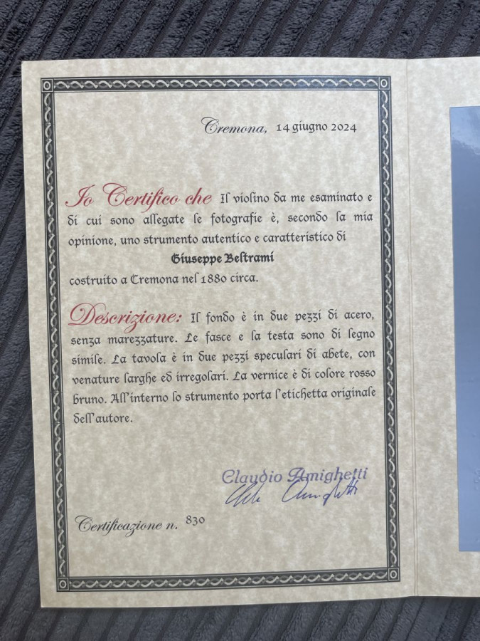 Italian 4/4 Violin with 1x Florian Leonhard Certificate and 1x Claudio Aminghetti Certificate Cremona Italia. GIUSEPPE BELTRAMI Cremona 1880 see photos. Selling from my private collection. Trade in change or exchange possible!