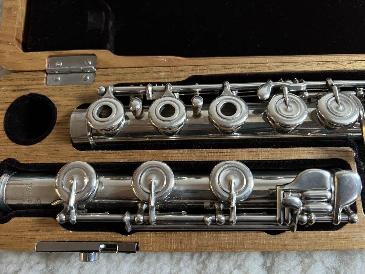 Vintage Powell Handmade Flute #1544 made in 1955 for Robert Baasch, mint condition, all silver body and keys, B-foot, Inline G, soldered tone holes, 18k gold lip-plate and riser, .014 wall, Pitch=440.