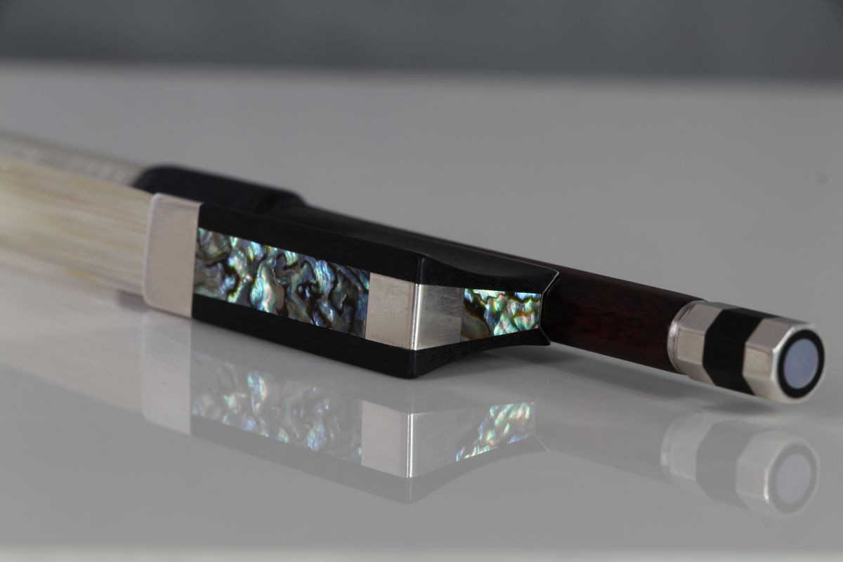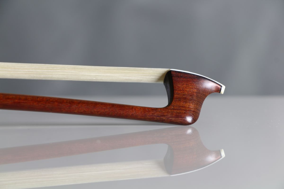 It features figured pernambuco with a ruby-like chatoyance which we've seen on top French bows like Thomassin. There’s clear influence of French traits in the carving of this head, and it flows quite nicely. The bow is generally graceful in its making, and there’s a extra piece of pearl on the frog heel with a nice glow.