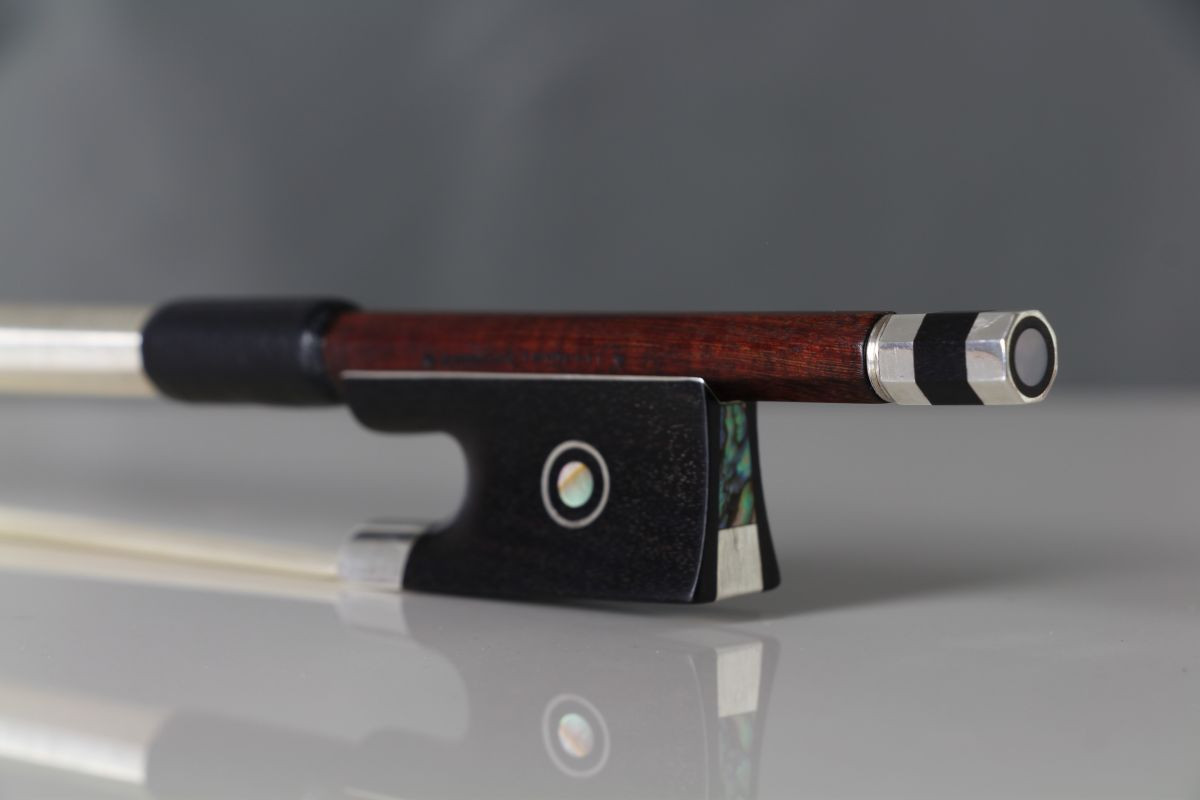 The bow imparts a deep and warm tone, and it's been recently used a lot for sound-testing instruments! This bow is in excellent condition and presentation. It has received a new thumb leather and silver winding.