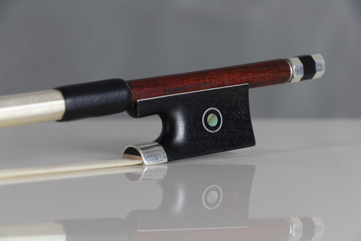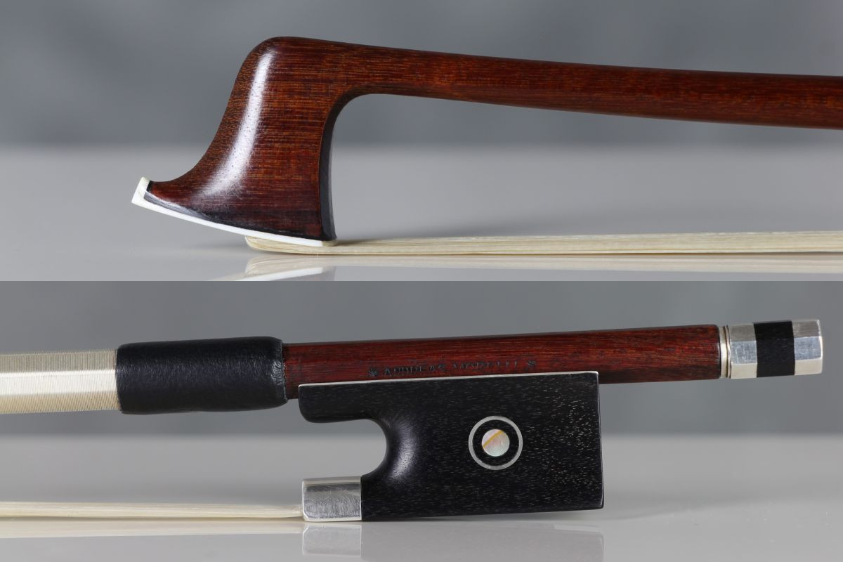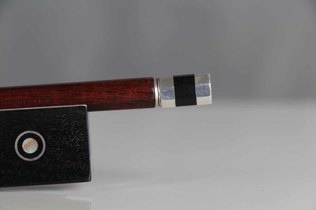 This is a stunning Andreas Morelli bow from the Karl Herrmann workshop, Markneukirchen, c.1920-30. Mounted in silver, with a length of 748mm and a weight of 60.9g. It bears the stamp ANDREAS MORELLI on the handle.