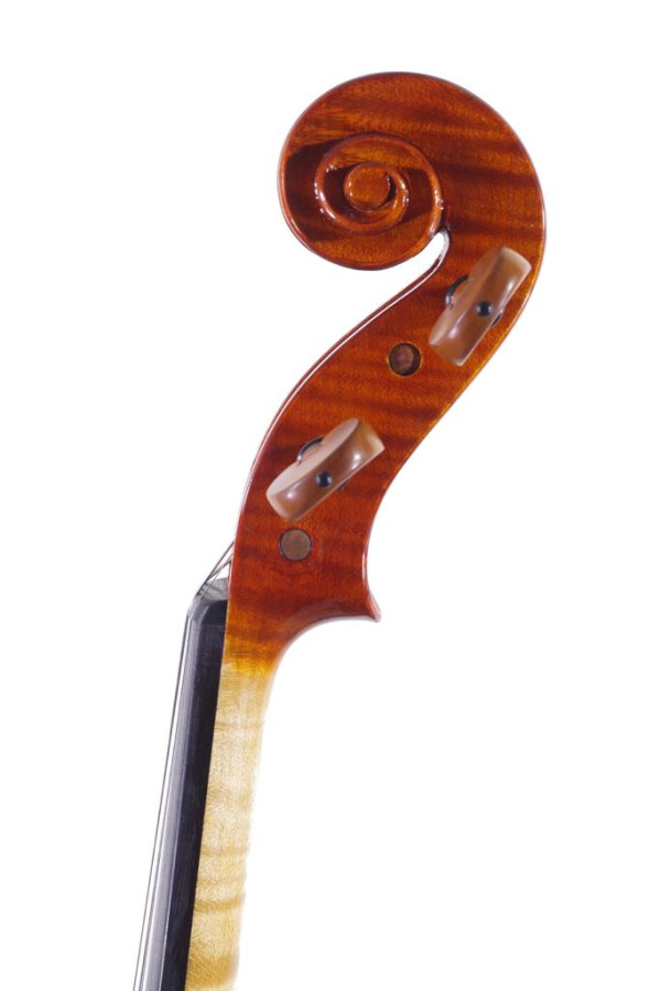 The top is made of beautiful red spruce from Val di Fiemme (Italy) with regular, deep, and well-marked fine grain. It is the same spruce already used by the great Cremonese Master violin makers which gives maximum musicality because it is particularly elastic. The aesthetically unique balkan maple is used for the back in two pieces, here with regular and well-marked medium-large grain, as well as for the head, here characterized by well-marked, regular medium grain.