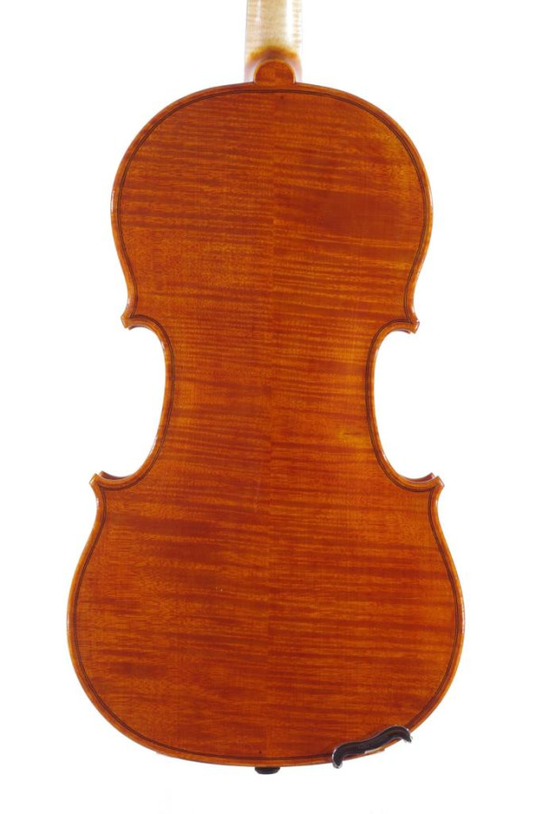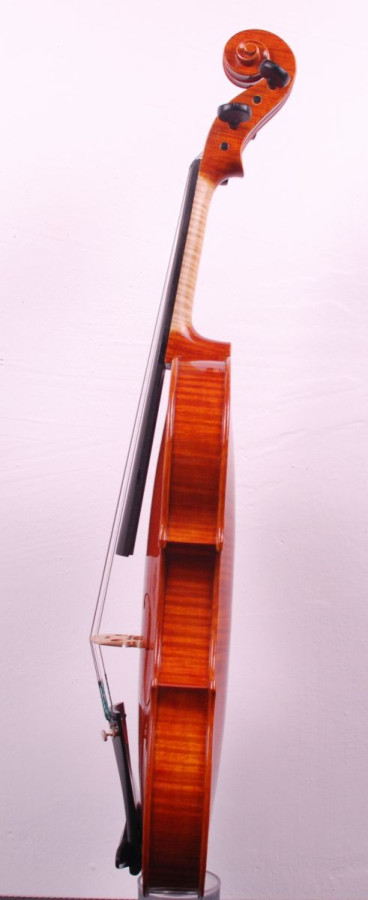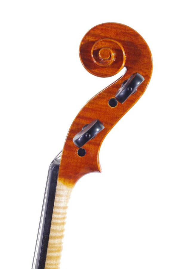 The top, as it dictates the famous Cremonese tradition, is made of red spruce resonance of Val di Fiemme (Italy), where the spruce trees provide the ideal raw material for the construction of the sound box, in this model with regular fine-grain, well-marked and threading. The bottom in two pieces are traditionally made of balkan maple with regular medium-fine, well-marked and uniform flame, that ensure the beauty of the instrument, as well as the refined head, also in balkan maple with medium-fine flame.