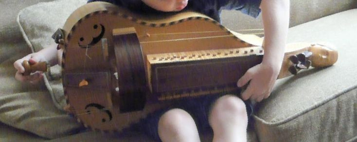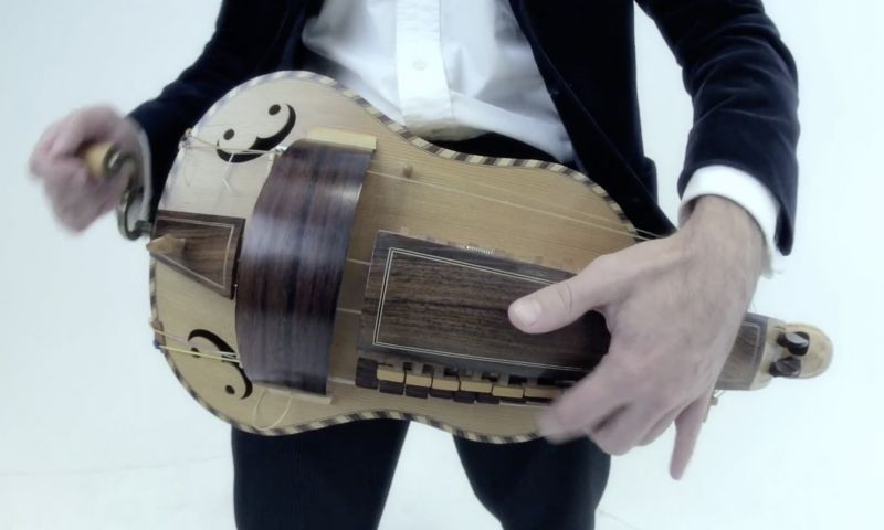 Hurdy Gurdy, flat back with guitar-shaped body made by Richard Smith, in black coffin-shaped case