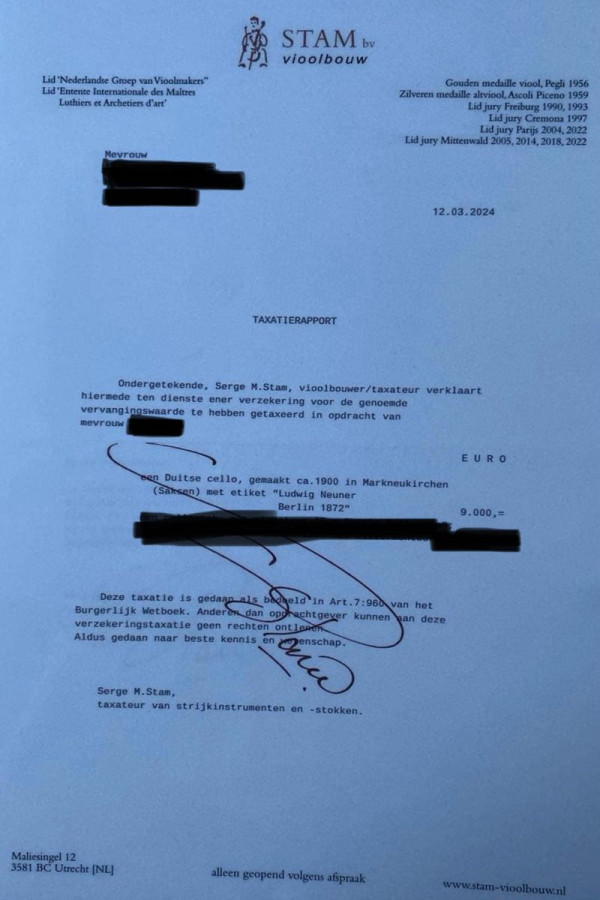 Certification: Certification: Certified by by S. Stam vioolbouw, Utrecht in 2024, Appraisal value € 9000