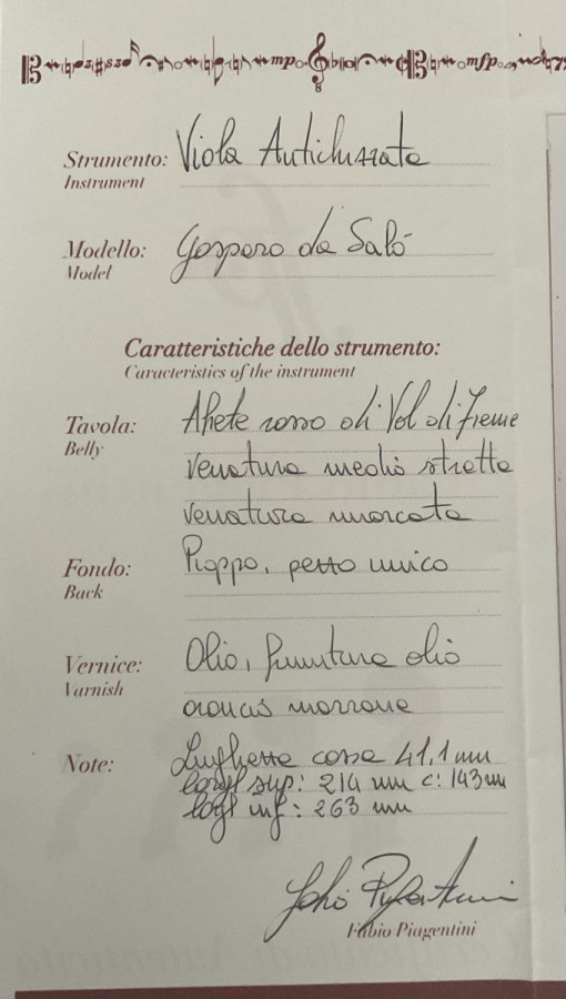 Viola del liutaio Fabio Piagentini, modello Gasparo da Saló, lunghezza 41,5. Realizzata nel 2020, in perfette condizioni, appena fatta una nuova messa a punto.