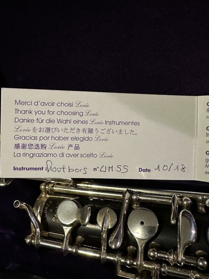 Has thumb plate, fitted by Lorée, third octave, long f, and sold with case and protective cover.
