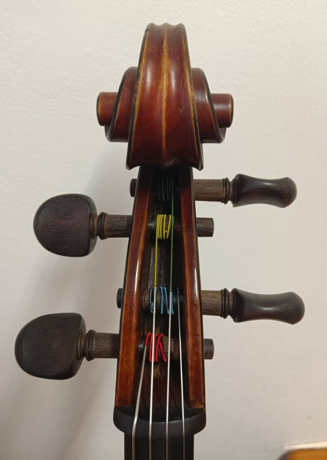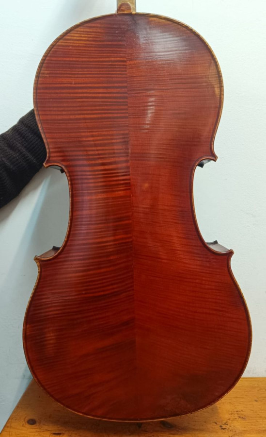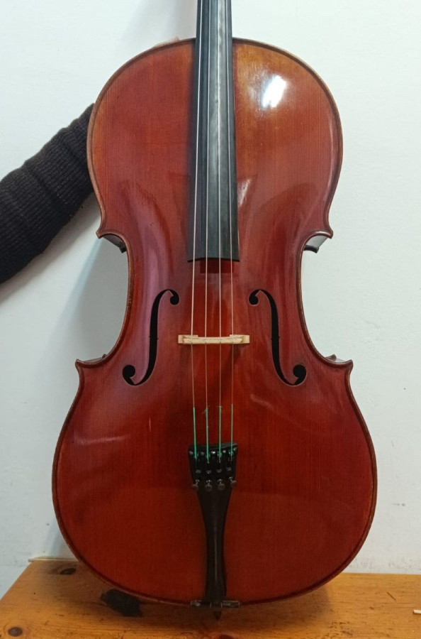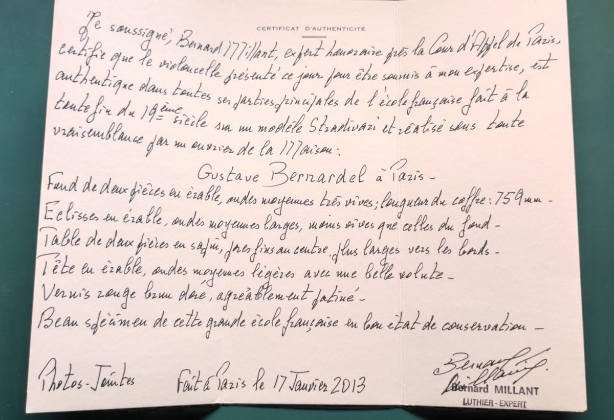 Wonderful Gustave Bernardel cello for sale, with certificate. Easy to play and very comfortable. Deep, rich sound with excellent projection. Some non-structural woodworm damage, hence discounted price. Exceptionally stable year-round and highly reliable.